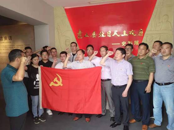 在紀(jì)念館史料展廳背景前,面對鮮紅的中國共產(chǎn)黨黨旗,全體黨員莊嚴(yán)地舉起右手,握緊拳頭,集體宣讀入黨誓詞,重溫入黨時的莊嚴(yán)承諾和堅定決心。